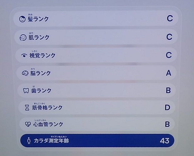 カラダ測定ポッドという機械で今の自分の健康状態を項目別に5段階(A~E)で評価してくれます。