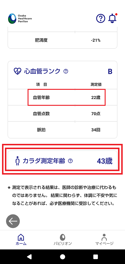 という事で体内年齢と血管年齢が22歳なのにカラダ測定年齢が43歳というカオスな結果になりました(笑)