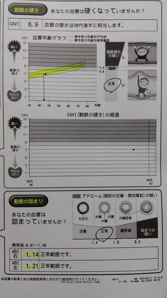 動脈の硬さも詰まりも正常範囲内で平均より少し良かったみたいです!