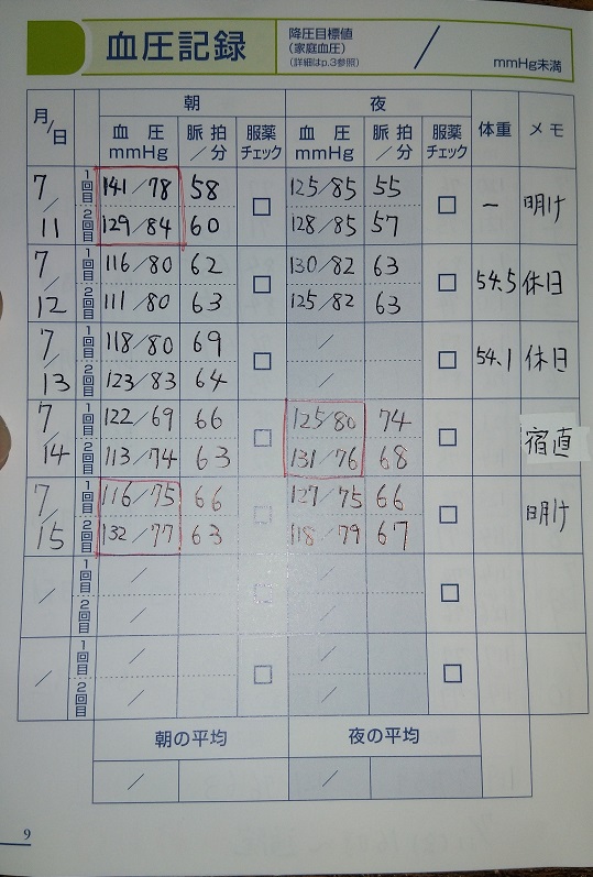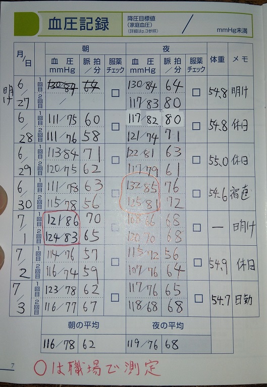 しかし記録を見ていただくと分かるかと思うのですが、勤務中に測った血圧が高いのです。