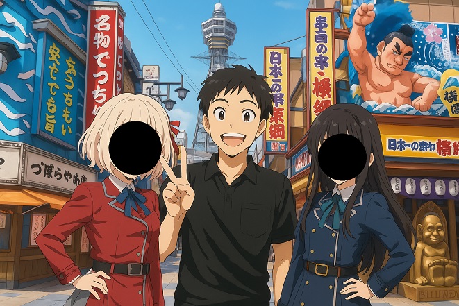 アニメ化したとはいえ、地元の公園のイラストをあげると特定されてしまうので背景は大阪の新世界にしました。