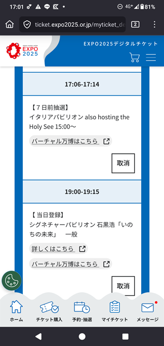 イタリア館は17時6分~だったので17時丁度に当日予約が解放される【いのちの未来】パビリオンをダメ元で狙ってみました。