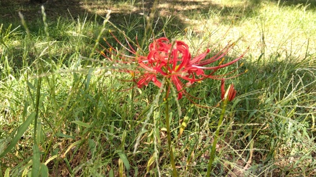 帰りに近所の公園に行ったんですが、草むらの中にポツンと1輪の彼岸花が咲いてました。