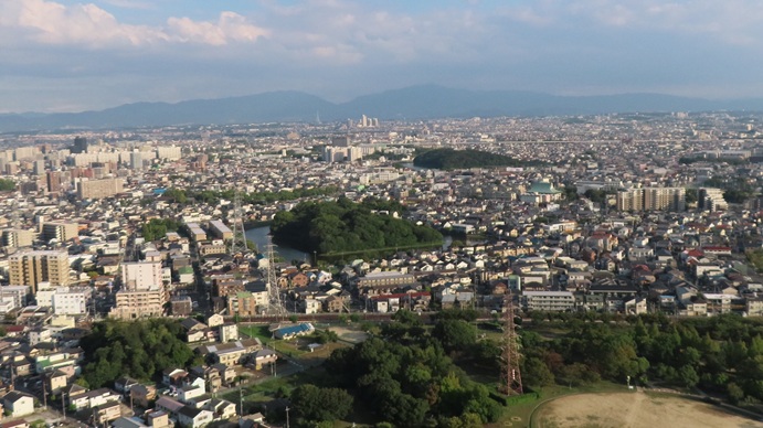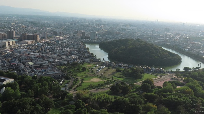 何年か前に仁徳天皇陵古墳を見に来た時、森にしか見えずガッカリした事を覚えていますが、上空100mからだと前方後円墳の特徴である鍵穴の形が確認出来ますね!