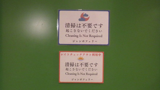 部屋の扉に忘れずに「清掃不要」と「レイトチェックアウト」の掲示物を貼っておきます。