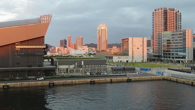 5時の時点では真っ暗でしたがレイトチェックアウトで7時まで船に残る事が出来たので朝の神戸港をバルコニーから眺める事が出来ました!