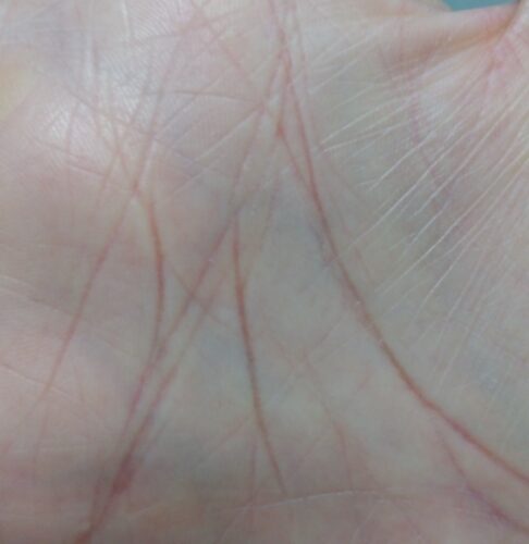 - 右手の「結婚線」が非常にくっきりしている: 小指の付け根付近にある横線(結婚線)が非常に深く、一本スッと力強く伸びています。これは、人生において強い絆を持つパートナーとの出会いや、安定した家庭生活を象徴するサインです。