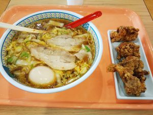 ラーメンに煮卵トッピング+からあげセットにしました。