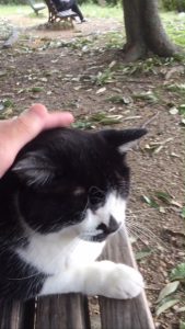 後ろを振り返ると白黒の猫がこっちを見ています。