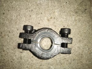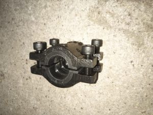 見ての通り配管を挟み込んで穴が空いている箇所の漏水を止めるものです。