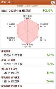 宅地建物取引業法等:62問中53問正解で正答率85.5%