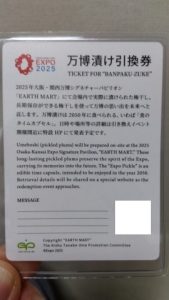 なんと万博会場内で梅干しを漬けて25年後にこの引換券を指定の場所(和歌山のどこか)に持っていけば梅干し1粒を貰えるらしいのです!