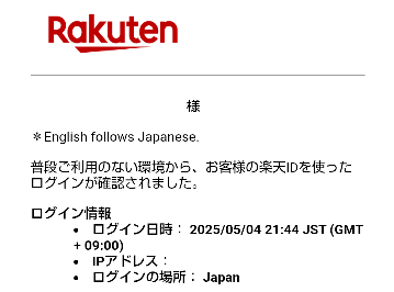 え!?その時間に楽天にログインなんかしてないぞ!!パスワードが割れたのか!?やばい!!