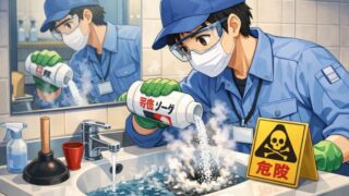 女子トイレの洗面台が完全に詰まった!ビルメンの僕がラバーカップ、U字トラップ清掃、ワイヤー清掃、そして最終手段の「苛性ソーダ」で解決するまでを実況解説。劇薬を使う際の注意点も実体験からお伝えします。